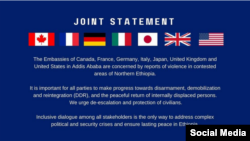 ኣብ ከተማ ኣዲስ ኣበባ ዝርከቡ ኤምባሲታት ሃገራት ብኢንዳስትሪ ዝማዕበላ ጉጅለ-7 "ኣኻታዕቲ" ኣብ ዝተባህሉ ኣዋሰንቲ ከባቢታት ክልል ትግራይን ኣምሓራን ዝተላዕለ ወጥሪን ግጭትን ከምዘተሓሳሰቦም ገሊጾም።
